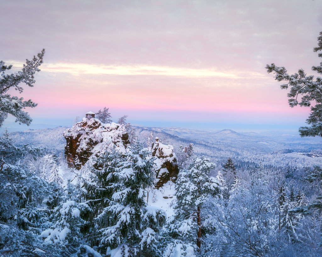 Už dlouho jsem se chtěl podívat na Rudolfův kámen, ne že bych tam nikdy nebyl, ale v hlavě jsem nosil fotku, kdy se za domečkem na Rudolfově kameni do červena zbarvuje nebe díky vycházejícímu slunci. A tak jsem se vypravil. Podmínky byly parádní, bylo nasněženo, teplota hluboko pod nulou (tam odkud jsem fotil, mi teploměr ukazoval -23°C) a téměř čisté nebe. Můžu konstatovat, že se jednalo o vůbec nejtěžší výstup nahoru, jaký jsem kdy absolvoval, protože jsem se poprvé do kopce brodil 75 cm sněhu a na stativu, který sloužil místo hole, se mi udělala 2 cm tlustá námraza. Myslím, že výsledek za tu námahu stál, on totiž národní park, má kouzlo i v zimě.